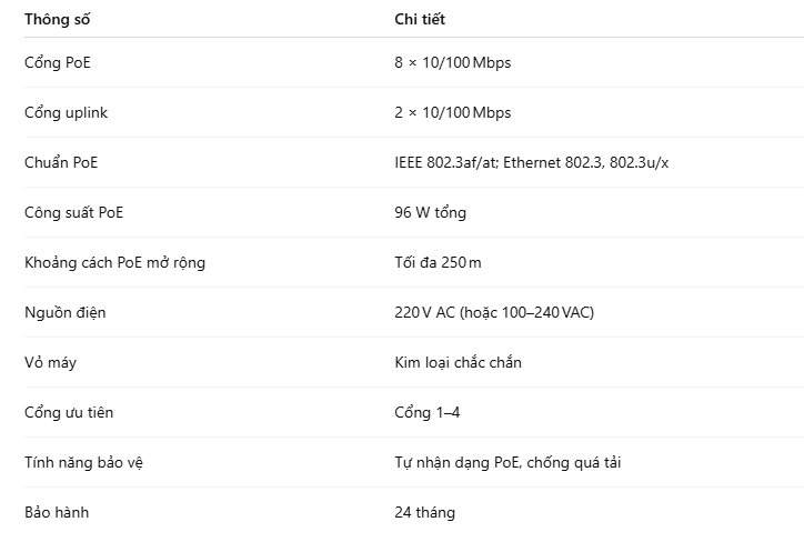 Tổng công suất PoE 96 W, đủ để cấp nguồn cho 6–8 camera IP tuân thủ tiêu chuẩn 802.3af/at